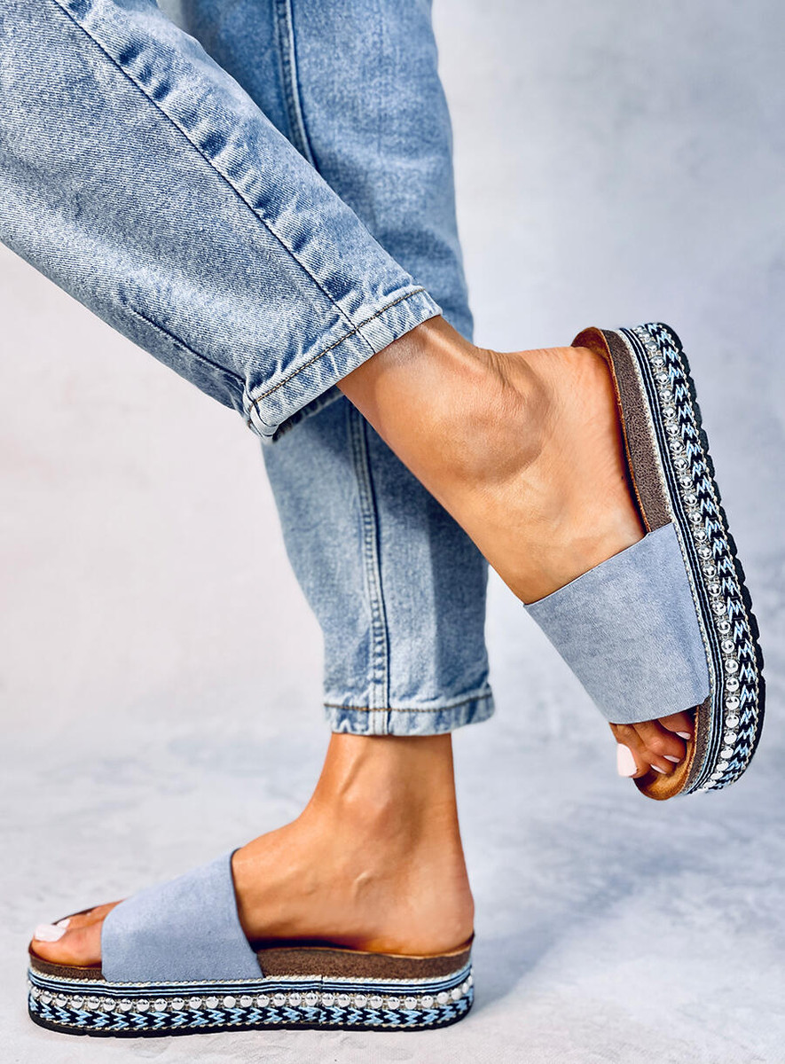 Dámske papuče s vysokou podrážkou. Široký pásik perfektne drží nohu a profilovaná vnútorná stielka poskytne úžasný komfort pri každom kroku. Vďaka zdobenej podrážke majú tieto šľapky takzvané "niečo"! Vonkajší materiál - ekologický semiš